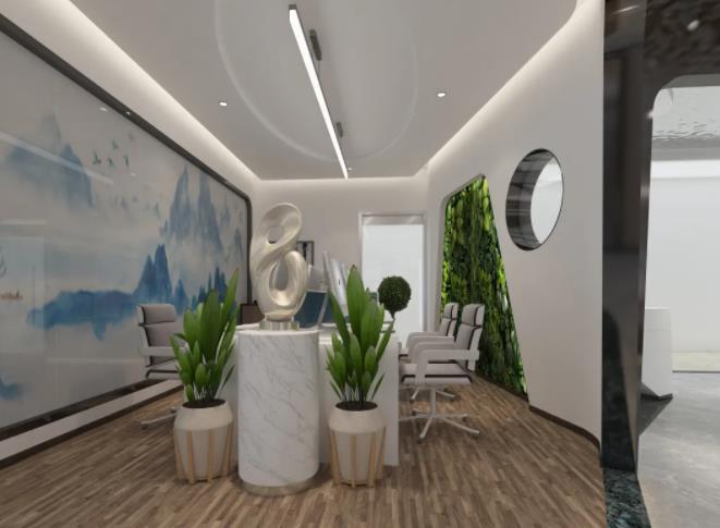 3、天花水波紋鏡面不銹鋼波光粼粼,倒影婆娑,中間點綴白色射燈,星光點點,仿佛仰望銀河,體驗區(qū)靠落地窗橢圓拱形網(wǎng)狀金屬鏤空材質(zhì),霧里看花,花更美,營造朦朧隱約東方詩意之境,呼應(yīng)品茶洽談區(qū)中式嵌入式茶桌,讓顧客感受尊貴體驗同時一覽江景,身心徹底放松達(dá)到物我兩忘之境。辦公樓產(chǎn)品展示區(qū)蜂窩背發(fā)光造型突出展品的高科技品質(zhì)感。辦公區(qū)裝飾設(shè)計:山水玻璃隔斷與綠植墻共同營造呼吸在山水綠意之間的意境,讓工作充滿詩意與生機,通透圓形玻璃與前廳區(qū)連接,運用借景設(shè)計手法,給空間帶來意趣。